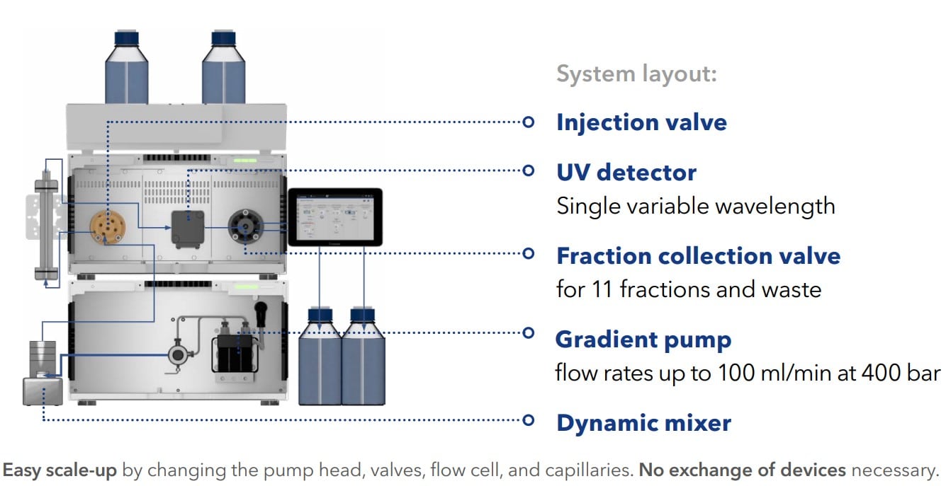 Due to its modular design, the system can be easily up scaled to higher flow rates by simply replacing the pump head, valves, flow cell and capillaries. The basic devices do not need to be replaced. The next scale-up level allows flow rates up to 200 ml/min at 200 bar. The 1/16″ capillaries are exchanged for 1/8″ capillaries. Higher sample volumes are injected via a channel of the gradient pump. The modules of the HPLC docking station and the valves are exchanged within minutes and allow to flexibly adapt the system to changing purification tasks.